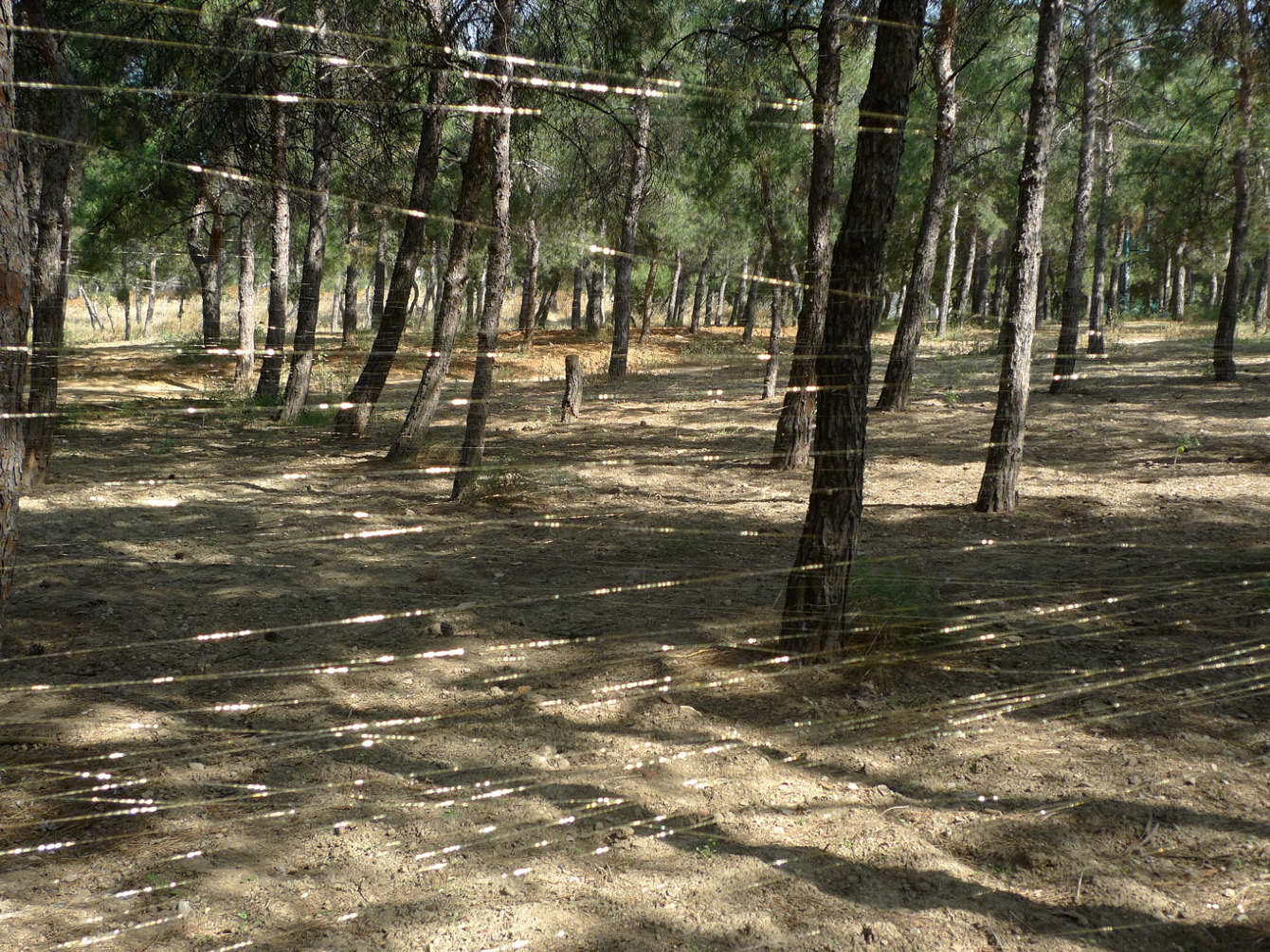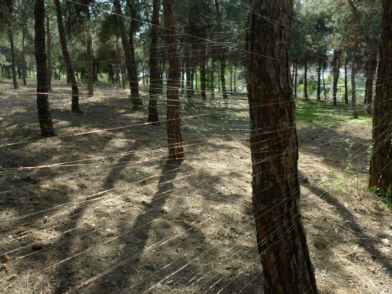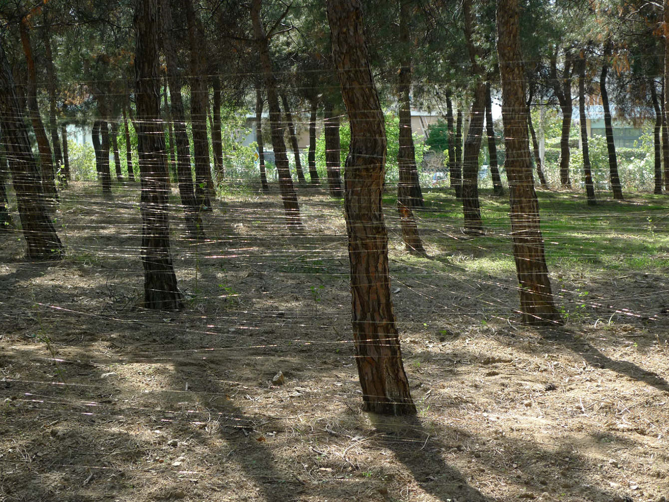 The thread knitted between pine trees in the park, was making up a concrete body by marking a specific space between the forest. Irregular surfaces are made out of golden threat bought in an Indian fabric shop in London. The treat which is attached on the trees resembles sunbeams but is horizontal. The viewers passing by are looking for distance guessing what can it be.