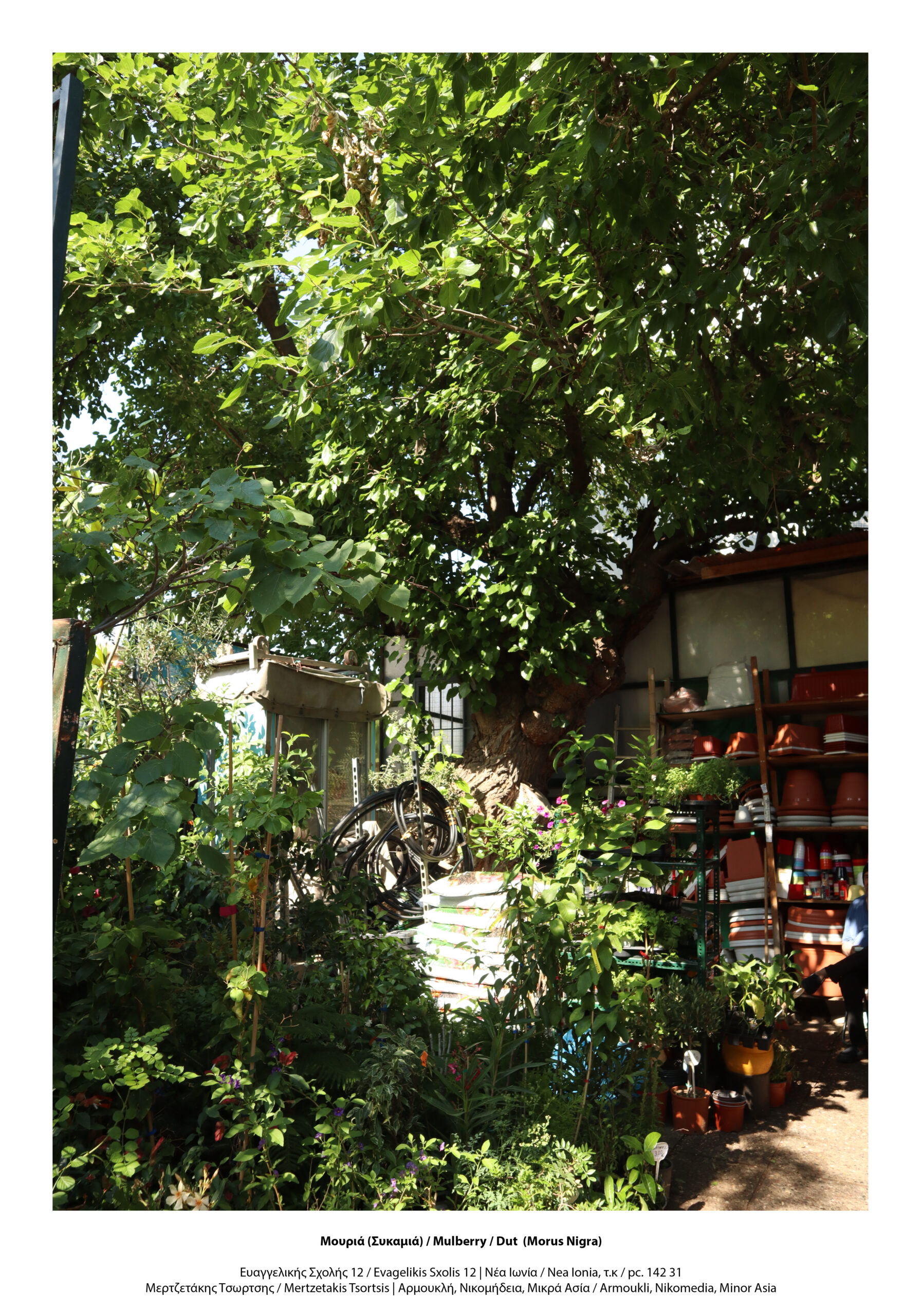 When they come to Greece in 1923, what amazes me in the stories is that dates and landmarks on the map are always blurred. Like if they don’t know exactly the place, the name, the date, like if it is not of importance.The craft that he knows is to grow silkworms. Starting from what he knows he plants the Mulberry tree that now is at least a hundred years old. Today the Mulberry tree is in the garden of what was their house and today is the flower shop of his daughter, with whom I talked with. Nea Ionia had a lot of mulberry trees because of that plant in the pavement, maybe from the people, maybe from the municipality, i don’t know’, she says. Most of these trees have been replaced today with bitter orange trees from the municipality.