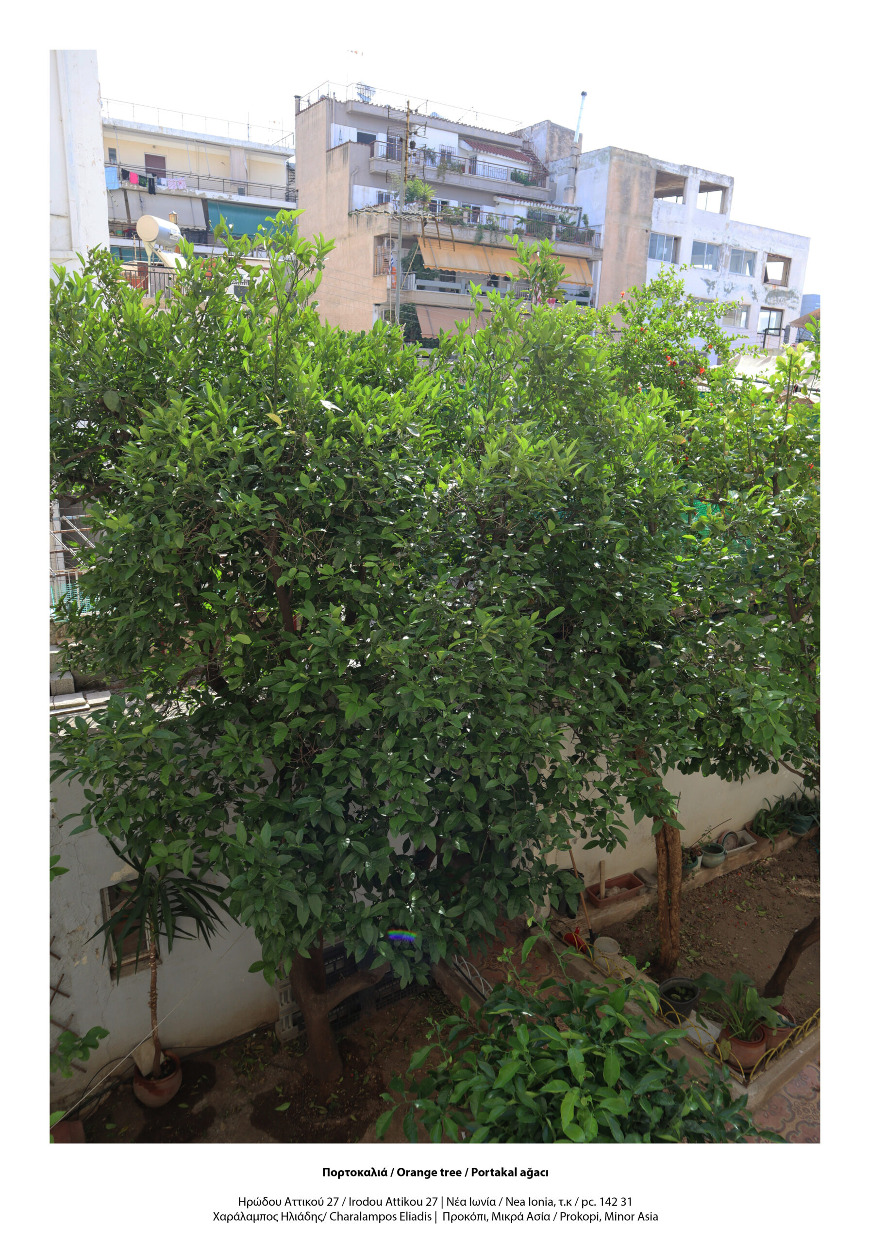 Πιθανόν φυτεύτηκε από τον Χαράλαμπο Ηλιάδη, το προπαπού μου, στην αυλή μαζί με μία μανταρινιά, μία λεμονιά, μία πασχαλιά, τέσσερις ροδιές,μια κληματαρια, μια αχλαδια μαζί με διάφορα λουλούδια και βότανα. Ο Χαράλαμπος Ηλιάδης ήταν μεγαλο έμπορος υφασμάτων στη Μικρά Ασία και ποιμένας της Ευαγγελικής εκκλησίας. Με κριτήριο τη θρησκεία του δεν δικαιούται περιουσία στην Ελλάδα. Οι προϋποθέσεις της συνθήκη της Λωζάνης ως προς την ανταλλαγή των πληθυσμών αφορούν τους Μουσουλμάνους Τούρκους και τους Ορθόδοξους Έλληνες. Μένει στη Νέα Ιωνία όπου και ιδρύει την τουρκόφωνη Ευαγγελική Εκκλησία της Νέας Ιωνίας.H πορτοκαλιά με συντροφεύει σε όλη μου τη ζωη όντας το πρώτο πράγμα που βλέπω το πρωί, μέσα από το πέρασμα των εποχών. Την παρατηρώ πολλά χρόνια, τις εποχές της, το πως παραμένει και καρποφορεί.