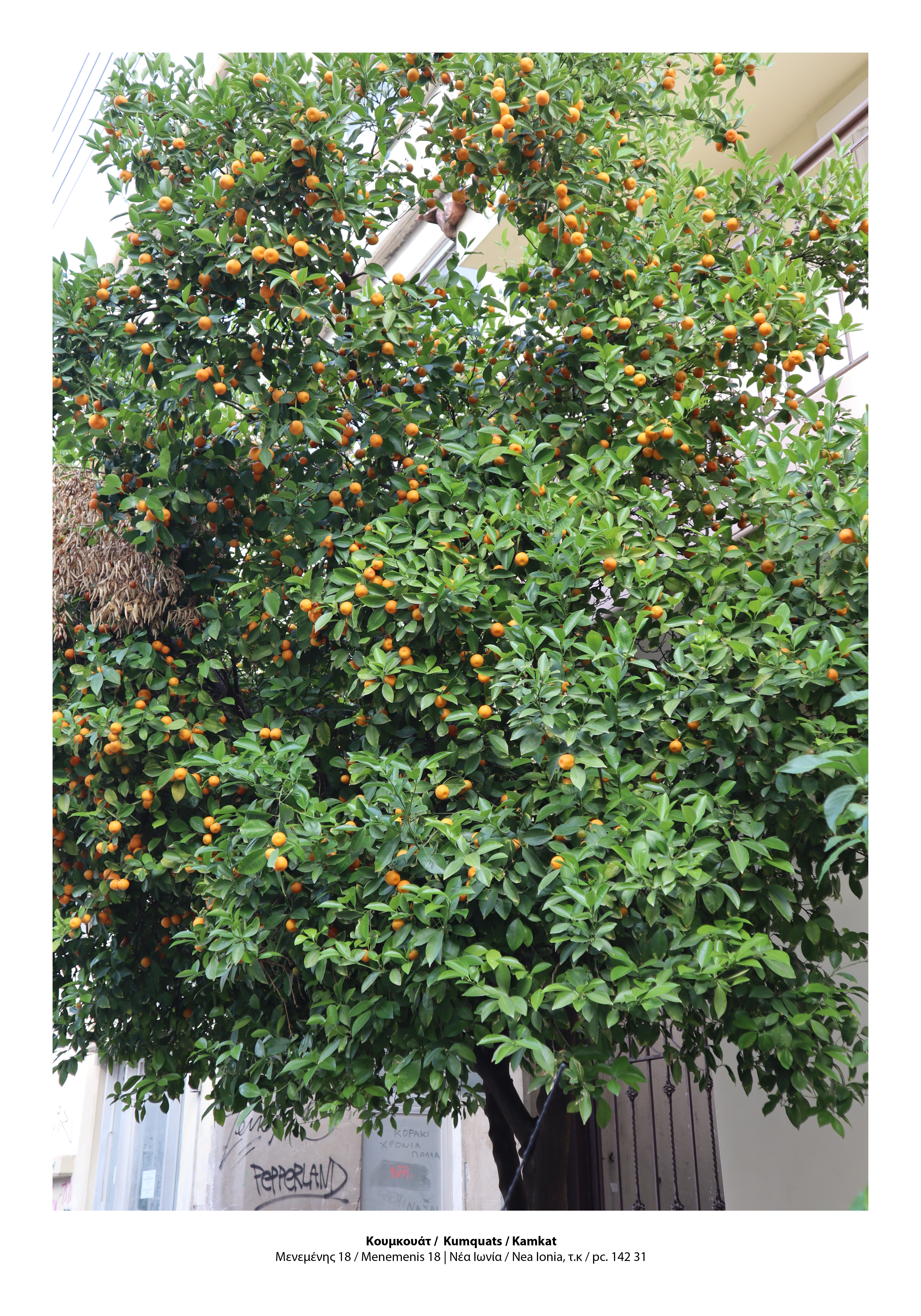 To Κουμ Κουάτ δέντρο στη Μενεμένης 18 στη Νέα Ιωνία, δεν έχω καταφέρει να βρω ποιος το φύτεψε, αλλά είναι το μοναδικό σε όλη τη περιοχή από όσο γνωρίζω, πιστεύω ότι ίσως είναι ανάλογο με τις ελιες, ότι φυτευτικε ως ωφέλιμο από τον ιδιοκτήτη του σπιτιού.
