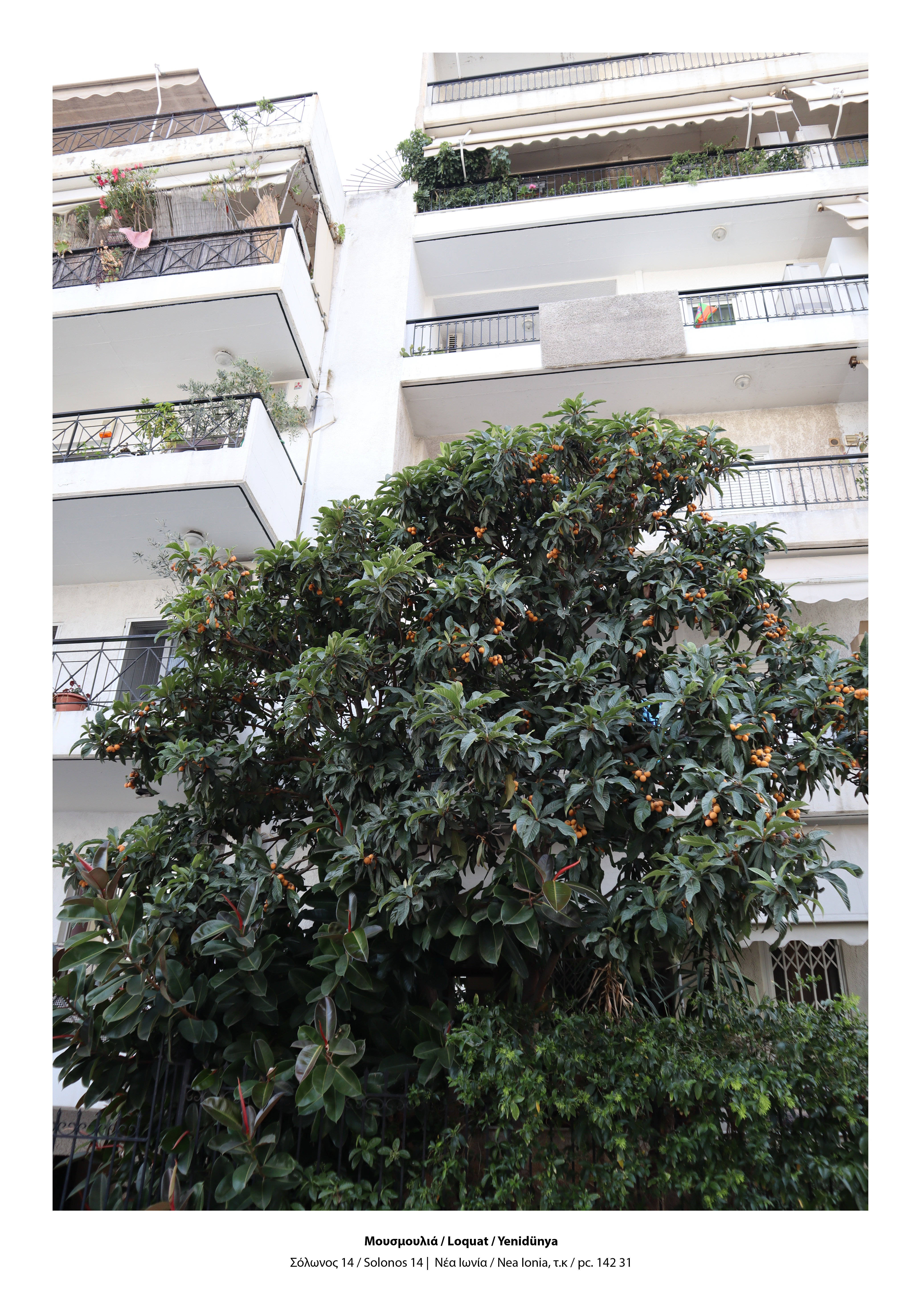 I never managed to find who planted the loquat tree, even though it has been cut out many times before, she reaches almost to the third floor. The building behind the tree looks like it was builded after, maybe in the 80s. With all the people in the balconies with whom I talk they say that it was always there nobody knows who planted it. I remember it for at least 43 years. The big white building seems to be in the time of ‘antiparochis’, they would give the land and their howse to a house contractor and then they would get some apartments from the building. I assume that probably the tree is where the garden of the house was.
