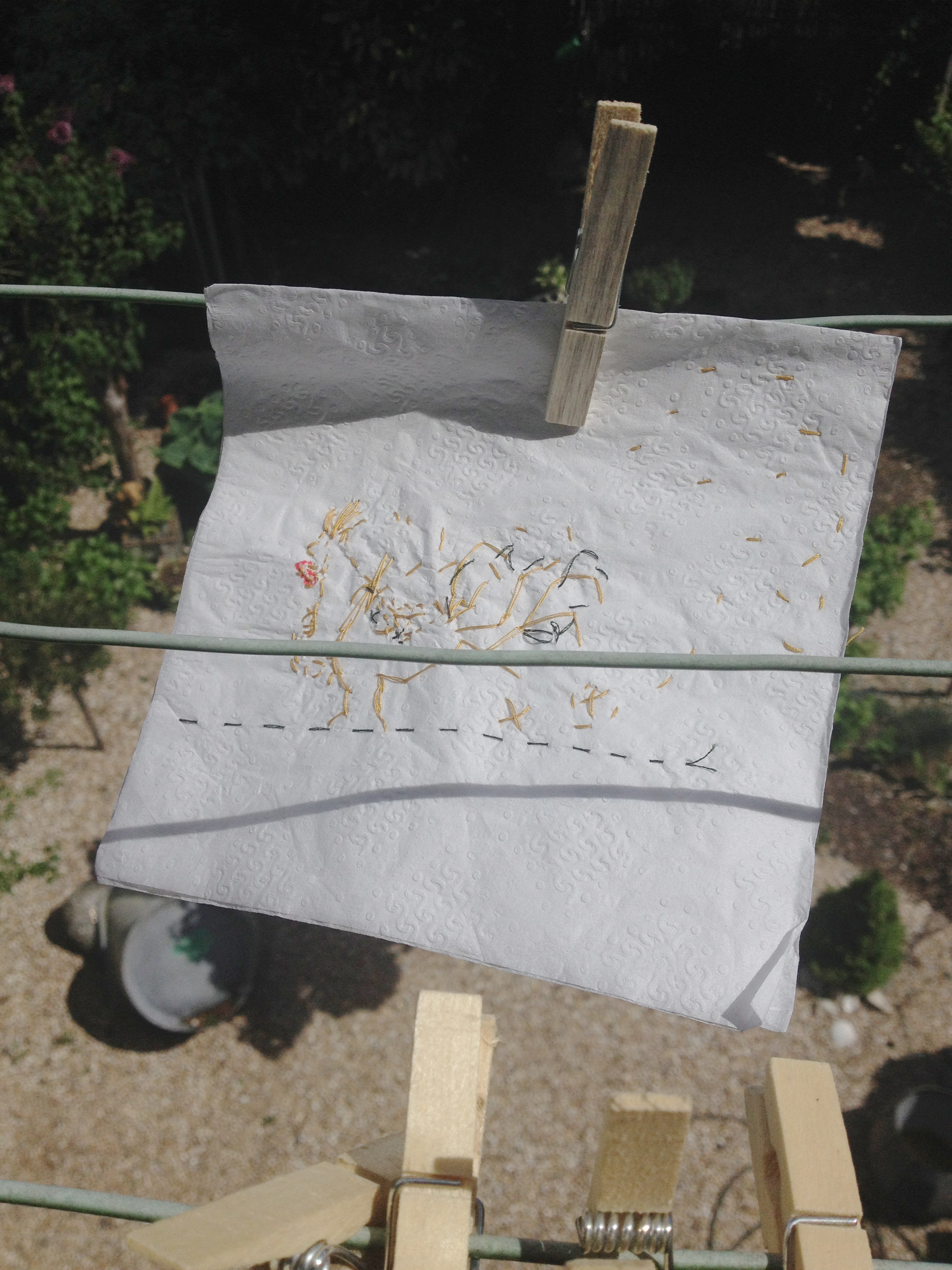 I bought two threats one dark green, yellow ochre and a needle. The idea was to make an embroidery and by that I would found time. It was an idea that I borough from one of my older works, at that time in London, I was joining together three silk papers by embroidering abstract forms on them starting from a decided tempo in the movement. In the end making up an unreadable calendar that had the sound of the silk papers moving. By imitating an tactic that women in different country use by crocket.